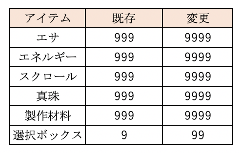 ・カバンのスペース不足を解消するために、一部アイテムのスタック数を増やしました。