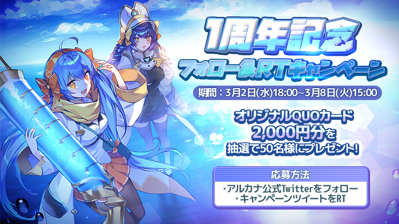 アルカナタクティクス公式Twitter(@arcanaTT_JP)をフォローし、キャンペーンツイートをRTすると、抽選で50名様に「オリジナルQUOカード2,000円分」をプレゼントいたします。