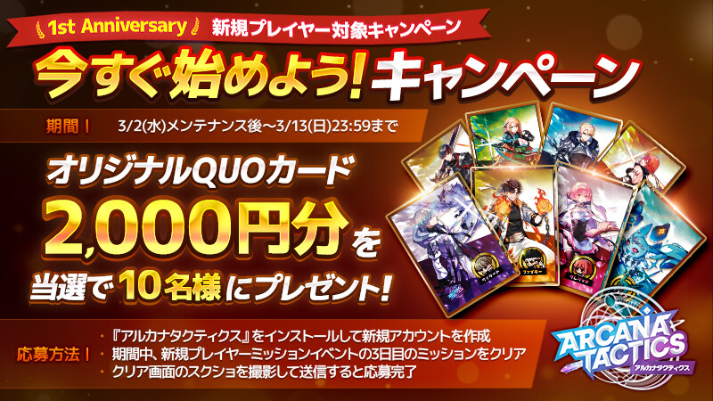 新規プレイヤーミッションイベントの3日目のミッションをクリアした画面のスクショを撮影して、専用フォームから応募すると、応募者の中から抽選で10名様に「オリジナルQUOカード2,000円分」が当たります。